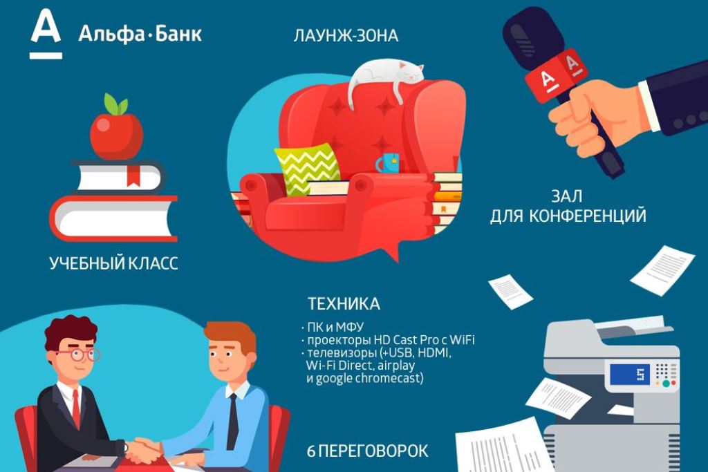 The first bank coworking with lounge and coffee shop. Alpha Business Hub is located on two floors and can accommodate up to 150 people. Businessmen have access to meeting rooms, a conference room, a classroom and modern equipment.